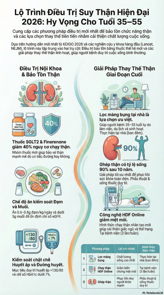 - Thuốc điều trị thiếu máu: Erythropoietin tổng hợp và bổ sung sắt (theo hướng dẫn KDIGO 2026 mới về quản lý thiếu máu)