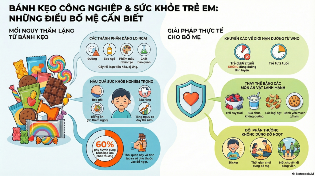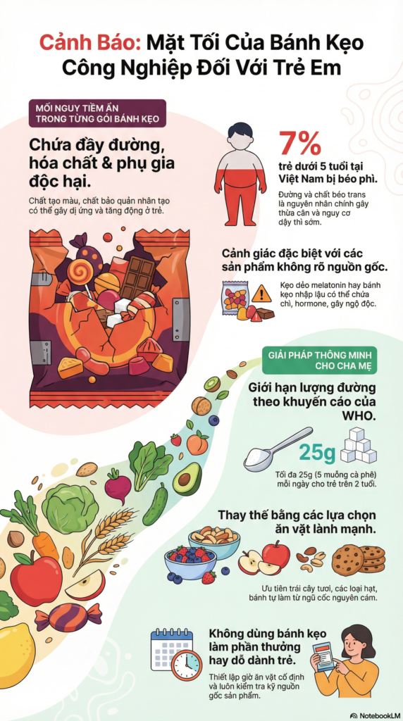 Bánh kẹo công nghiệp dù có mùi vị hấp dẫn nhưng chứa một lượng lớn đường và phụ gia hoá học gây ảnh hưởng nghiêm trọng tới sự phát triển cả về thể chất và trí tuệ của trẻ dưới 6 tuổi. Phụ huynh cần nâng cao nhận thức, phối hợp cùng chuyên gia dinh dưỡng để hướng trẻ sử dụng món ăn vặt lành mạnh hơn. Việc kiểm soát lượng đường bổ sung hằng ngày theo tiêu chí WHO là bước cần thiết nhằm bảo vệ nền tảng sức khoẻ tương lai của trẻ em.