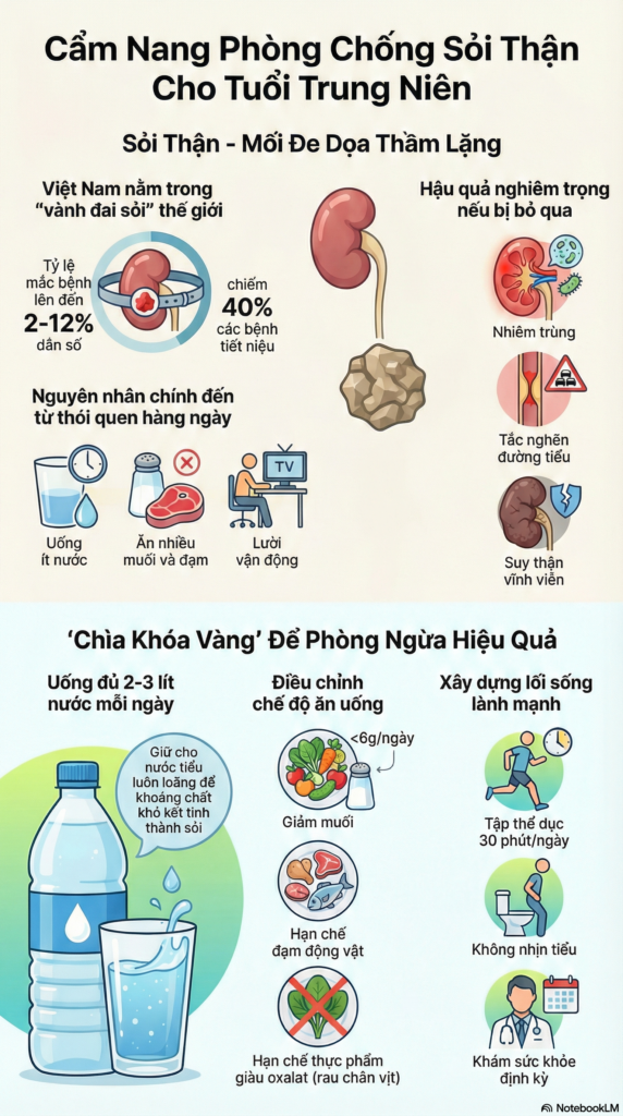 Tuy nhiên, với sự phát triển của y học hiện đại và sự hiểu biết ngày càng sâu sắc về bệnh lý này, sỏi thận hoàn toàn có thể được phòng ngừa và điều trị hiệu quả. Các trung tâm y tế uy tín thế giới như Mayo Clinic, NIH đã đưa ra những hướng dẫn toàn diện và khoa học dựa trên bằng chứng lâm sàng, cho thấy việc thay đổi lối sống toàn diện, duy trì chế độ ăn uống hợp lý, bảo đảm cung cấp đủ nước và theo dõi sức khỏe định kỳ là những biện pháp then chốt giúp ngăn ngừa bệnh và tái phát của bệnh này.