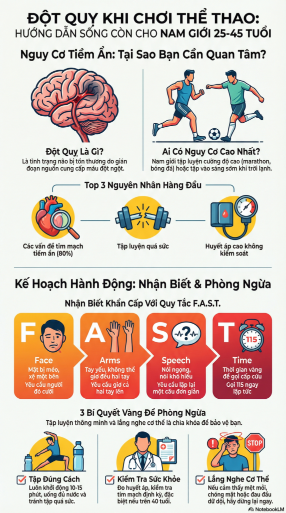 Đột quỵ ở người chơi thể thao là một vấn đề sức khỏe nghiêm trọng có thể xảy ra khi tập luyện với cường độ cao, đặc biệt ở những người có yếu tố nguy cơ tiềm ẩn. Mặc dù hoạt động thể chất mang lại nhiều lợi ích cho sức khỏe tim mạch, nhưng cần được thực hiện một cách thông minh và an toàn.