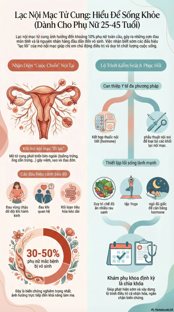 Lạc nội mạc tử cung là một bệnh lý phụ khoa phức tạp với nhiều khía cạnh về triệu chứng, cơ chế bệnh sinh và hậu quả. Mặc dù vẫn còn nhiều điều chưa được hiểu rõ hoàn toàn về nguyên nhân gây bệnh, nhưng với sự tiến bộ của y học hiện đại, nhiều lựa chọn điều trị hiệu quả đã được phát triển để giúp bệnh nhân kiểm soát triệu chứng và cải thiện chất lượng cuộc sống.