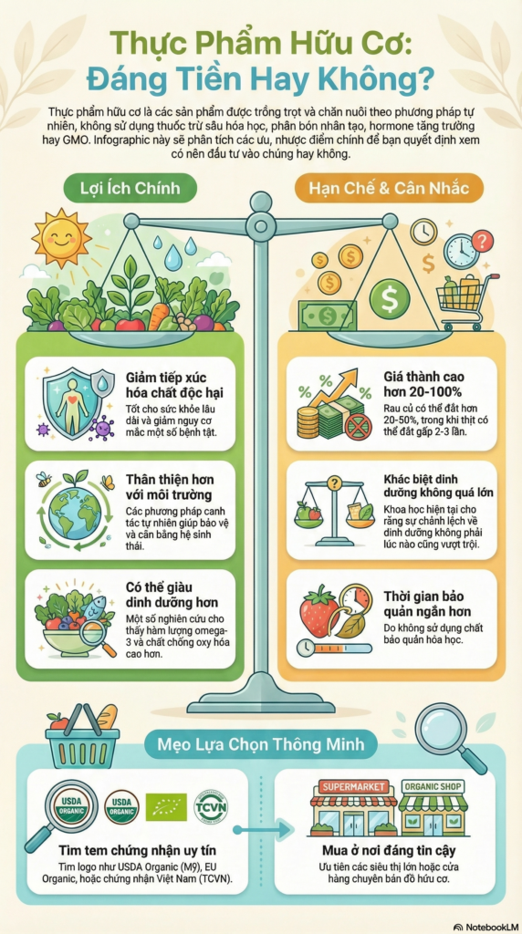 Tuy nhiên, thực phẩm hữu cơ cũng có những hạn chế. Giá thành cao hơn là điều không thể tránh khỏi – thường cao hơn từ 20-100% so với thực phẩm thông thường. Thời gian bảo quản ngắn hơn do không sử dụng chất bảo quản hóa học. Thêm vào đó, một số nghiên cứu như được công bố trên Khoa Học TV cho thấy chưa có bằng chứng rõ ràng về độ dinh dưỡng cao hơn so với thực phẩm thông thường [10]. Điều này cho thấy cần có cái nhìn cân bằng và toàn diện khi đánh giá giá trị của thực phẩm hữu cơ so với thực phẩm thông thường.